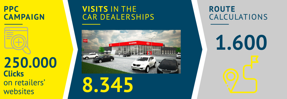 In the first month of the campaign period alone, the SEA campaign guided well over 200,000 relevant interested parties to the retailers’ websites, approx. 8,350 in the car dealerships and 1,600 route calculations were counted.